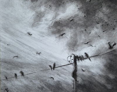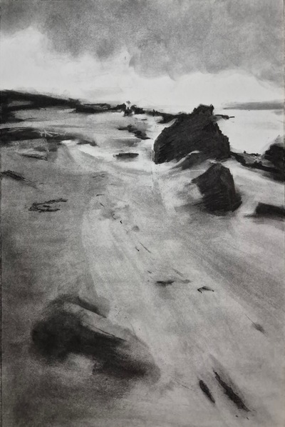 'Working with charcoal is like pure meditation. I gradually build up many fine layers, fixing the work in between each layer until completion. I use a variety of different charcoal to create different depths and tones, which includes charcoal I made myself from foraged materials such as twigs, pine cones etc. '
