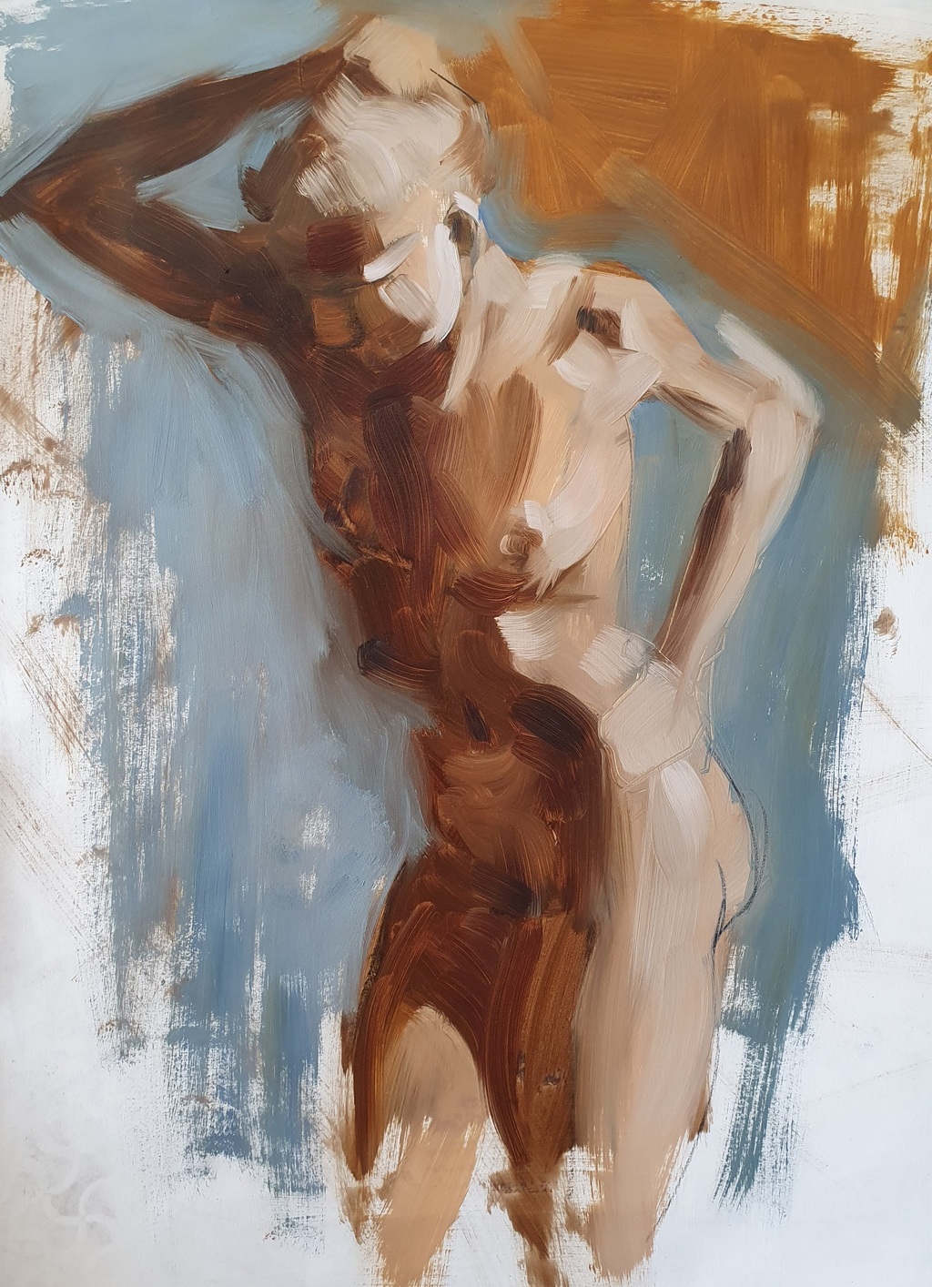 'I love working with oil paint as a material and particularly using the wet on wet technique for faces and figures. It's like working with clay, allowing me to almost sculpt and build the form of the face or figure stroke by stroke. This technique also enables the integration or melding of the brush marks, further adding to the feel of sculpting and cohesion. I have recently enjoyed glazing over a first layer of paint, once almost dry, which pushes the image back and allows a further play on a wet layer which creates more depth within the figure/face.'