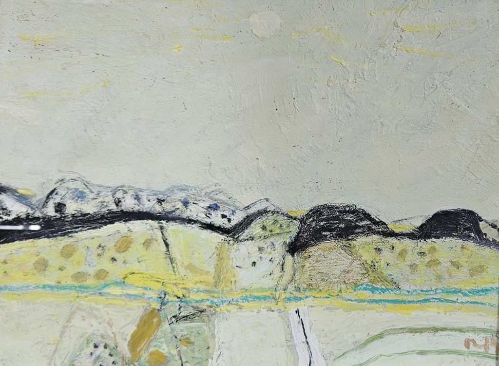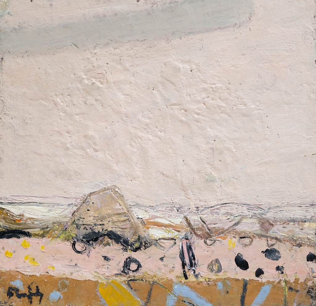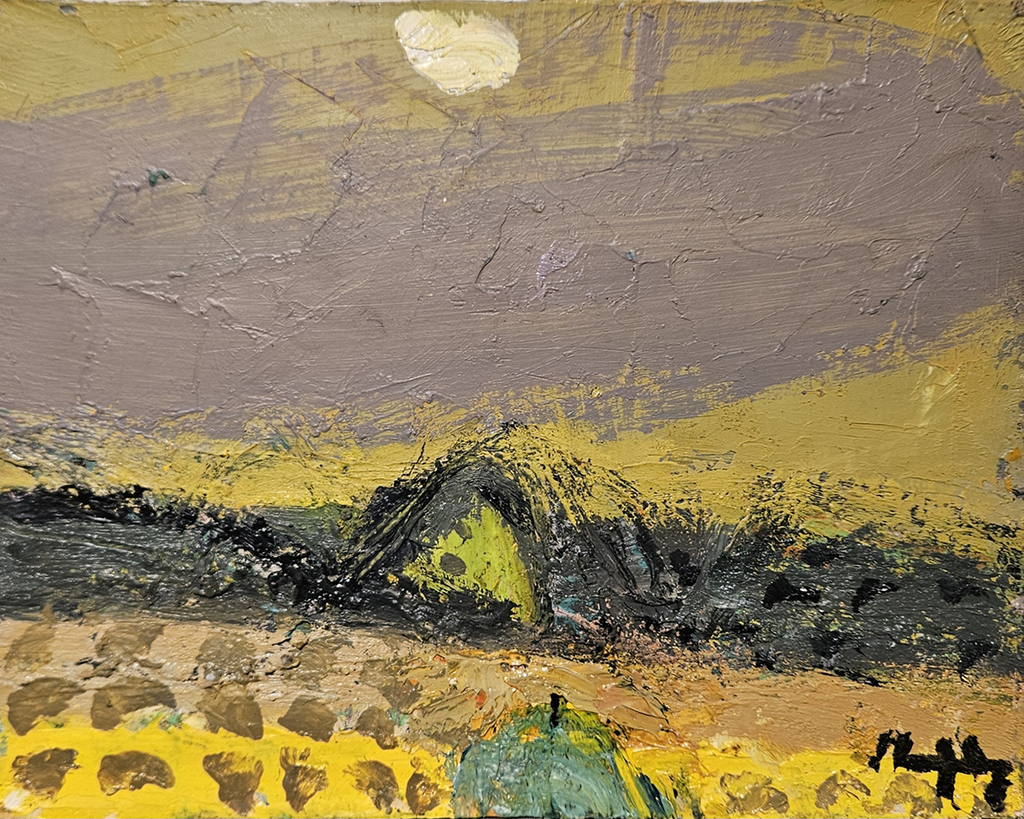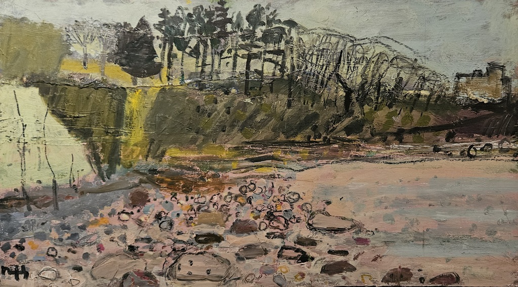While working on larger work, he uses sketches and small working oil sketches created in the studio as a starting point or as a reference. But for the most part, his paintings tend to be conceived as he works, applying and removing paint, scraping into surfaces, images appearing and receding, colours and marks changed and altered as he tries to create a tactile vision of landscape.