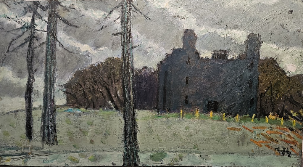 His work has a number of recurring images. Sometimes it is the hills that surround West Kilbride where he lives and works, other themes are the landscapes of Galloway or the gorge at Culzean Castle, which has resulted in a series of paintings, two of which are included in this show.